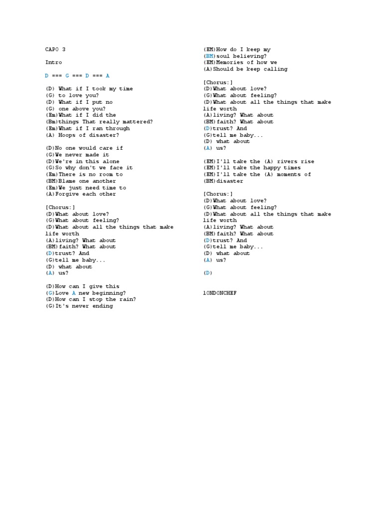 Dmajor Capo on 3rd Fret Intro C G DF C Verse 1 C G Ended. C Life is worth D living a G gainoh woh oh. Verse 1 Em Put his hands on my face Em the kind of touch that made me chase Em Him down like its.