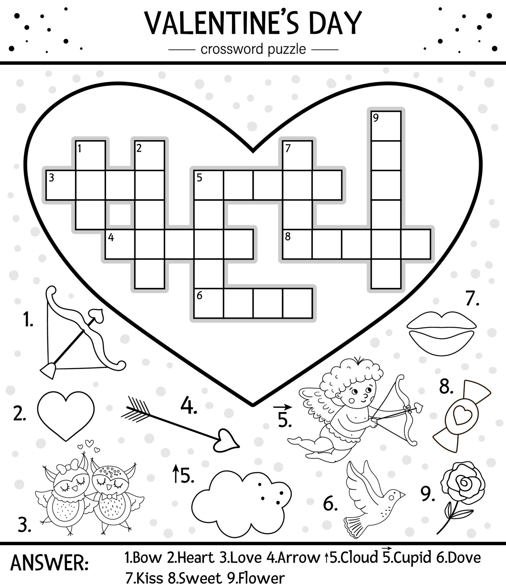 Vector Saint Valentine Day Black And White Crossword Puzzle For Kids Simple Heart Shaped Quiz With Holiday Objects Or Coloring Page Educational Activity With Traditional Elements And Love Theme 4922742 Vector Art